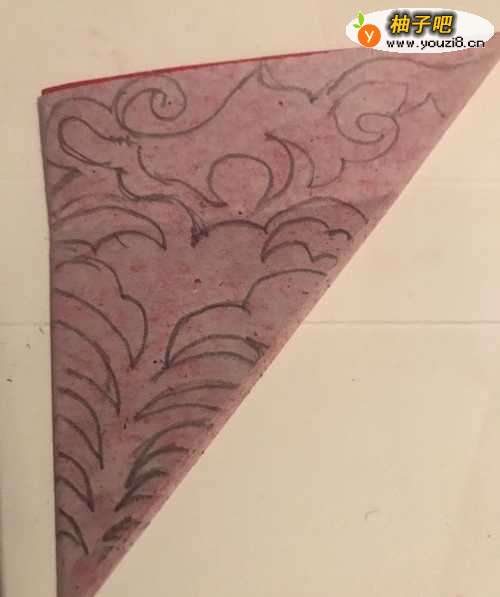 儿童手工剪纸 如何用彩纸裁剪一副美观看漂亮的方形纹样窗花图案 需要材料为正方形红色彩纸一张 折叠办法沿对角线连续折叠三次 然后单页边朝上摆放 用绘图铅笔分两步画上自己喜欢的图案 最后修改一遍 剪下即可完成