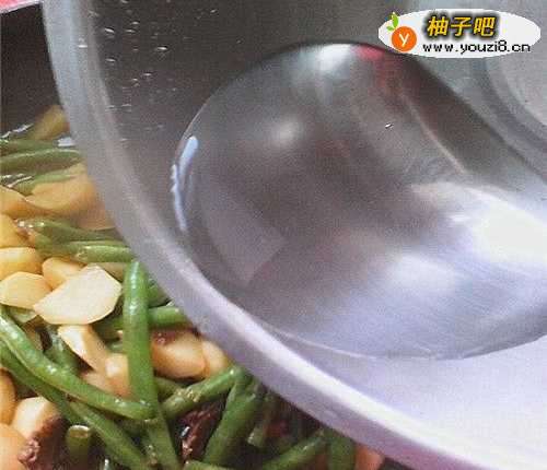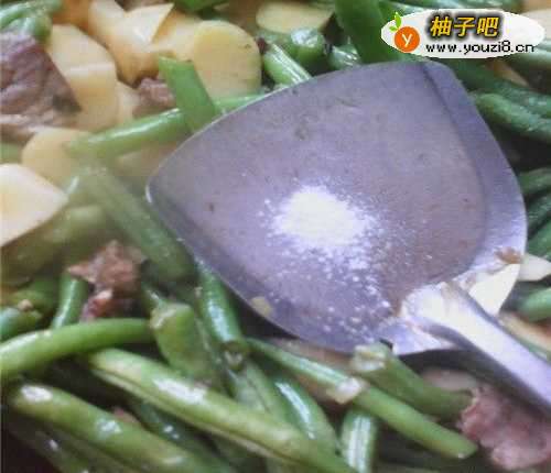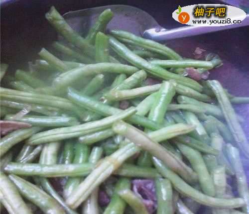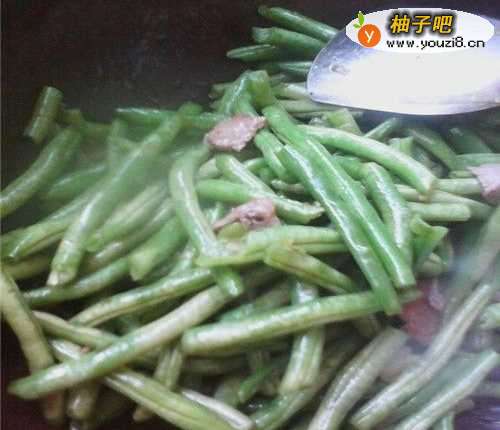 3加入掐好洗净的豆角和肉片一起炒,勤翻别让锅糊了,