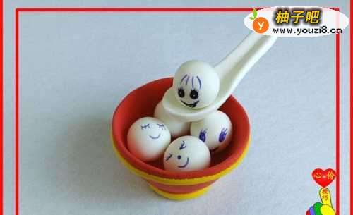 10晾干后,将“元宵”和“勺子”放入碗中。