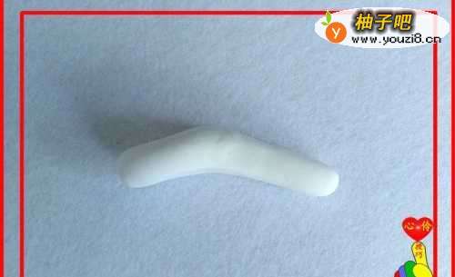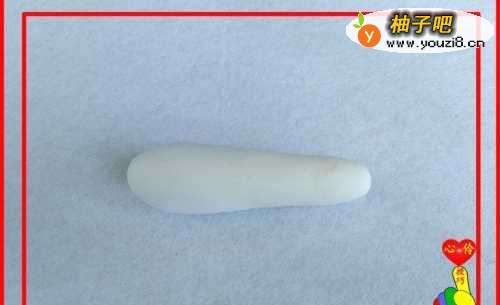 7取白色彩泥适量,滚搓成一头大,一头小的形状。