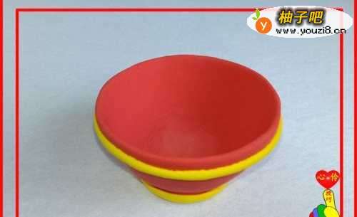 6再取金黄色彩泥适量,滚搓成“细长条”,对碗进行装饰。