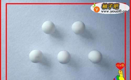 2取白色彩泥适量,滚搓成5个小圆球。