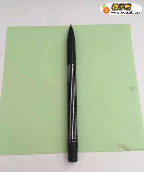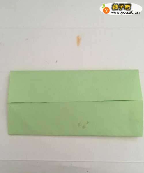 第一步 把一张16厘米X16厘米的正方形粉绿色彩纸 从下向上折叠后取开 然后上下两边都向里折叠至中线