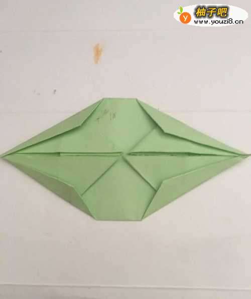 6第六步 折叠完之后 上下两个尖角 都向里折叠 然后再留有一点距离再向外回折 留做头的那个角再向里折一点尖 作为头部 翻过来 画上眼睛就行了