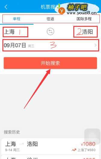 2然后,在启用的机票检索页面,选择我们乘坐飞机的出发站和终点站,然后选择乘坐飞机的日期,如下图