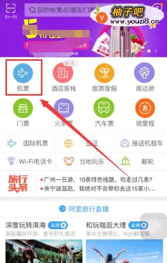 首先,我们要有一台智能手机下载有阿里旅行的客户端,启用这个客户端软件,如下图,我们选择“飞机票”按钮,去购买飞机票