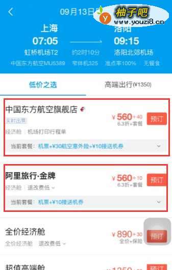 6选好乘坐的机票时间和班次,下面就是选择乘坐飞机的航空公司,根据报价选择购买机票的商家,里面有航空公司直营,也有阿里旅行直售,如下图