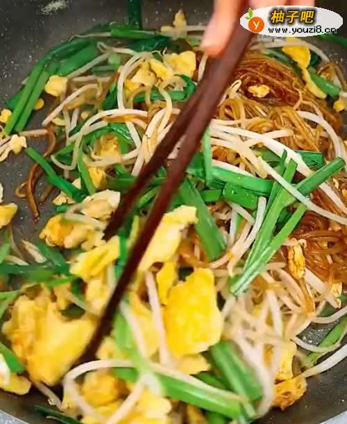 4倒入泡发好的粉条,加入生抽、老抽、鸡蛋、韭菜段,加入盐、白糖、味精