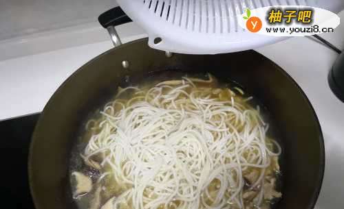 88.下米粉,如果要下丸子也在这个时候下,如果感觉水不够,就再加点,要漫过米粉。然后盖上锅盖,煮4-5分钟。