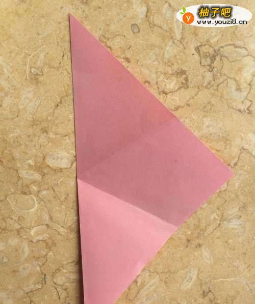 我们先选一张粉色的正方形彩纸,或者红色的都能,然后我们把对角对折起来