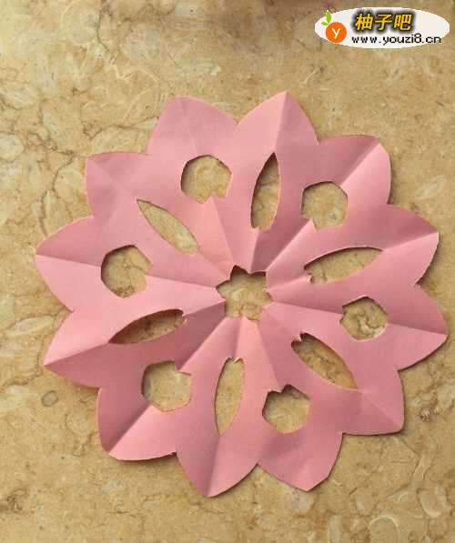 7最后我们把彩纸展开,我们的美丽的菊花手工剪纸就完成了。