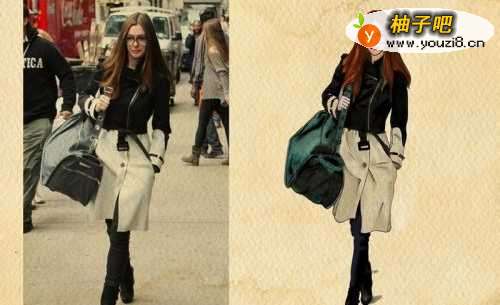 黑白拼接的风衣,色彩对比鲜明。黑色上半身酷劲十足,提高了腰线。风衣搭配黑色皮靴,拉长了身材比例。一个超大的帆布背包,更显随意洒脱。