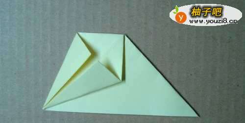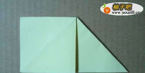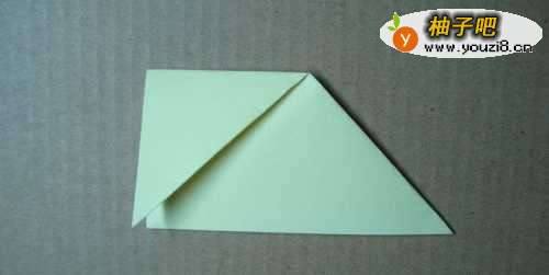 2接着把正方形彩纸对折为三角形,然后把上边三角向下折,并压平整,如下图所示。