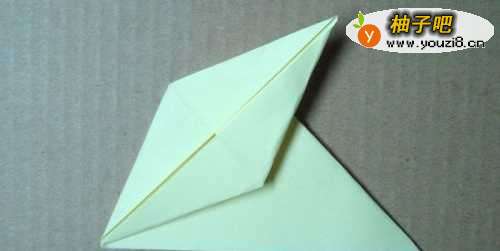 5然后把彩纸左边的两个三角形向内展开,提拉翻折为一个棱形,并压平整,如下图所示。