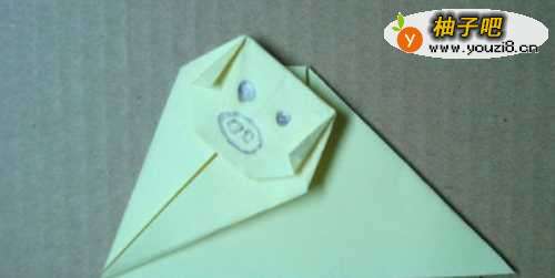 7然后把彩纸左边的棱形的左边向外折出一个斜三角,右边也向外折出一个斜三角。这是折出小猪猪的耳朵,这样小猪猪书签就做好了。拿出铅笔在折纸上给小猪猪画上眼睛和鼻子。折纸就更为生动形象了,如下图所示。