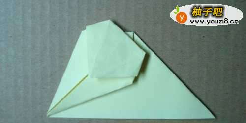 6接着把彩纸的棱形的一角向下折平,这是折出小猪猪的头,把棱形底边的一角向上折,这是折出小猪猪的嘴。并压平整,如下图所示。