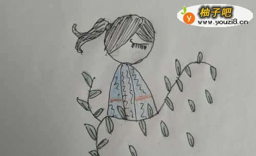 5画好女孩子后我们再画女孩子身下的树藤,几条弯曲的线,在上面画上相应多的树叶。