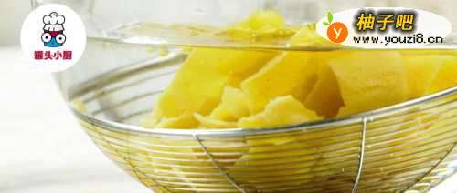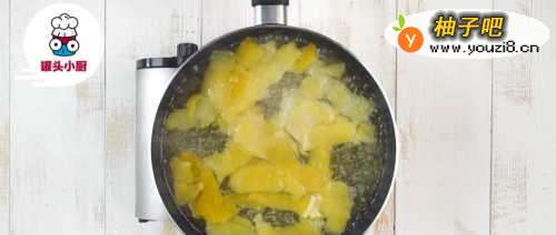 2锅中倒入淡盐水,放入柚子皮,开大火煮沸,捞起用清水浸泡一晚后,再次放入锅中,加清水煮沸,捞出过冷水沥干