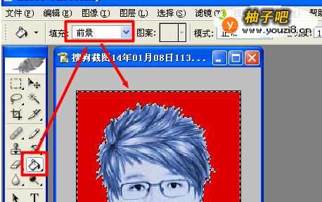 4选择“填充”工具,将“填充内容”使用为“背景色”,点击“照片背景部分,即可完成照片背景色的替换。