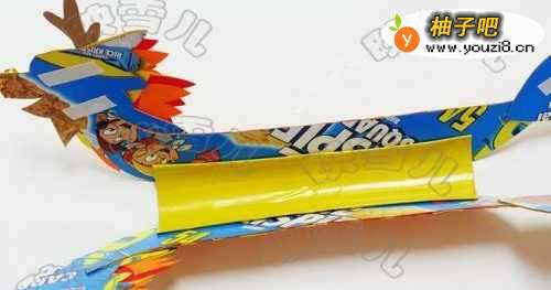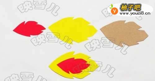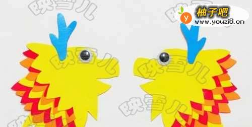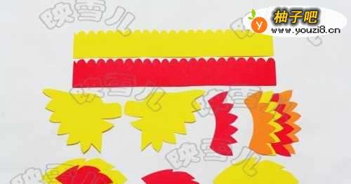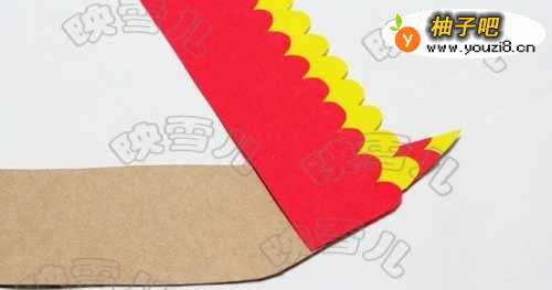 12红色的纸卡粘在黄色纸卡中间,然后再粘到纸皮上做成尾巴。