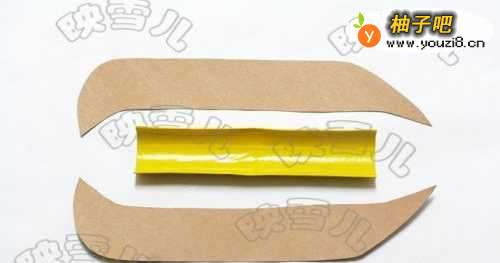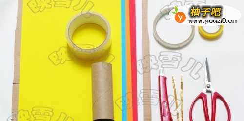 材料:彩色纸卡,纸皮,活动眼睛,透明胶,双面胶(或胶水),纸筒,黄色电工胶,小刀,金色铁丝,剪刀。