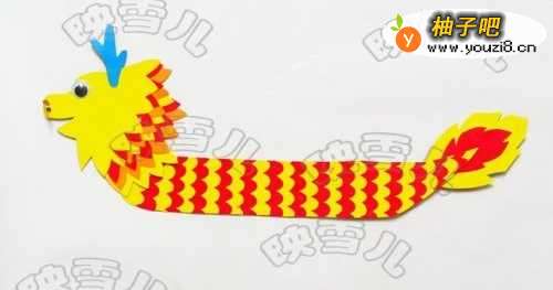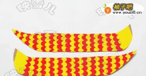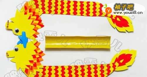 7波浪纹卡纸做龙的鳞片,如图相间隔粘贴。多出的部分剪掉。