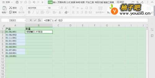 2在汇总页,选择单元格【B2】,输入公式【=SUM('1:4'!B2)】;