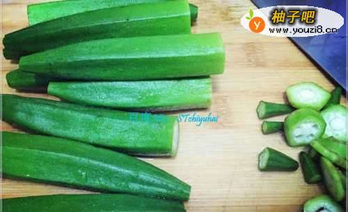 4将清洗后的秋葵切去头尾较老部分,然后将其斜切成薄片状。