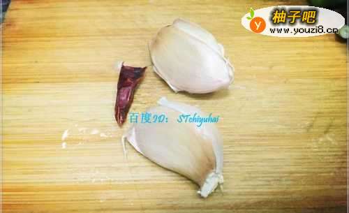 6准备少许辅料:蒜头、辣椒干,分别处理一下;重新往锅内加入少许油,放入辅料爆香一会。