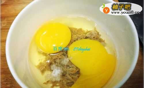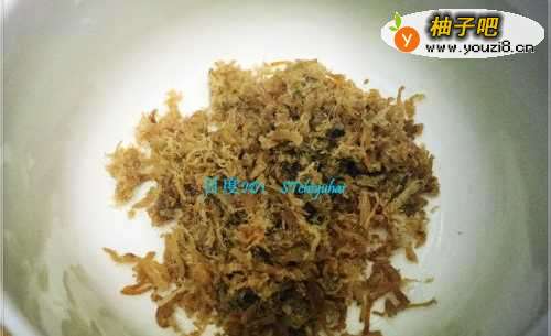 准备若干肉松,将其放入碗中;准备一到两个鸡蛋。