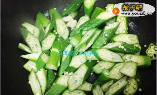 7先将秋葵放入,中火翻炒一会,待有七八分熟后再加入煎好的肉松鸡蛋,将其捣碎,然后混合炒一会,加入各种调味料,炒匀后即可关火装盘了。