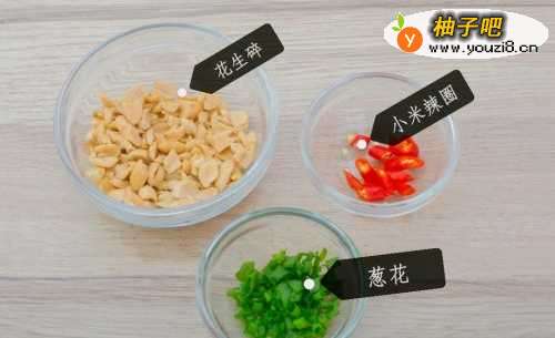 花生剁碎,葱切花,小米椒切圈备用。