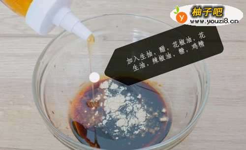 2准备一个大碗,加入生抽,醋,花椒油,花生油,辣椒油,糖,鸡精搅拌均匀。