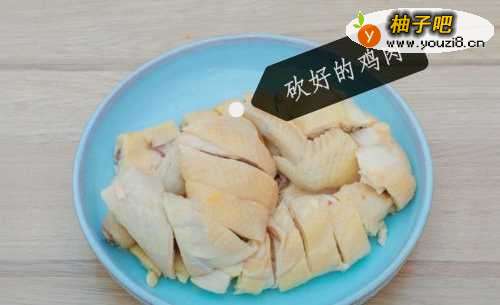 4锅里加400克清水煮开,放入鸡肉煮20分钟,捞出来过冷水,砍成小块装入碗里。