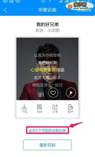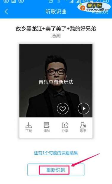 4如果音乐播放器没有允许准确地识别,比如只是识别出串烧音乐中的一段,我们能点击最下面的“重新识别“。如图所示: