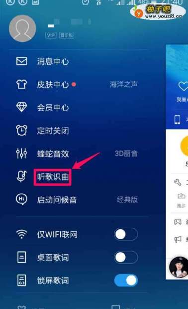 首先启用音乐播放器主界面,向右滑动屏幕,在主菜单栏中点击“听歌识曲“功能。如图所示: