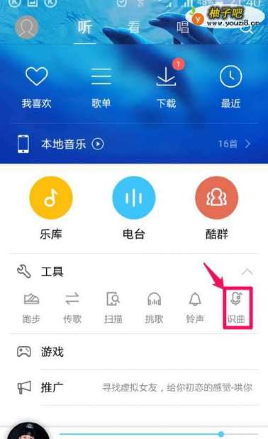 2在主界面中的工具菜单下,我们也能找到“识曲“功能。如图所示: