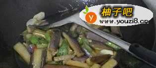 3将油倒入锅中烧热,放入肉末煸炒,然后在炒好的肉末中拌入黄豆酱和胡椒粉,再加入茄子段一起翻炒