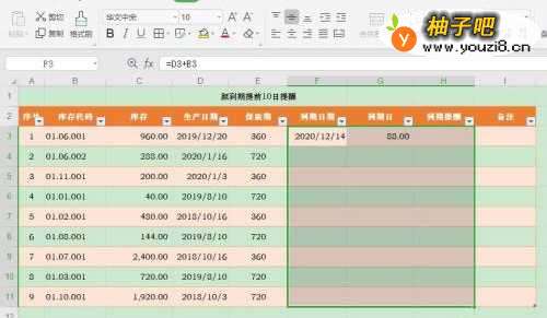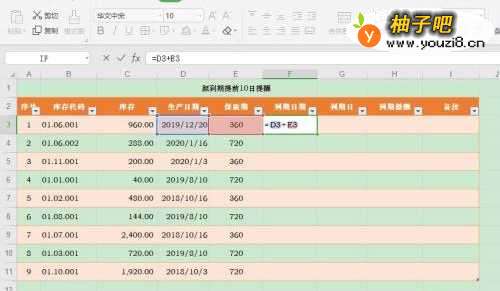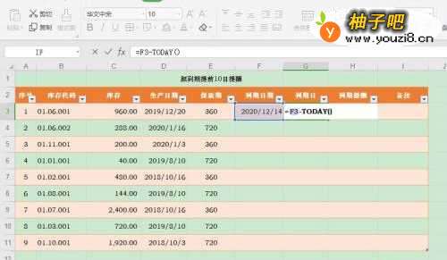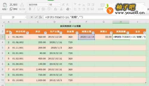4选择单元格【H3】,输入报告的公式【=IF(F3-TODAY()<10,"到期","")】;