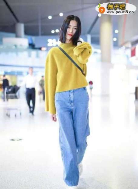 姜黄色短款毛衣搭配蓝色阔腿牛仔裤小白鞋,不但会彰显的整个人特别的自信阳光,同时很多青春的张力,给人一种很舒服的视觉感。