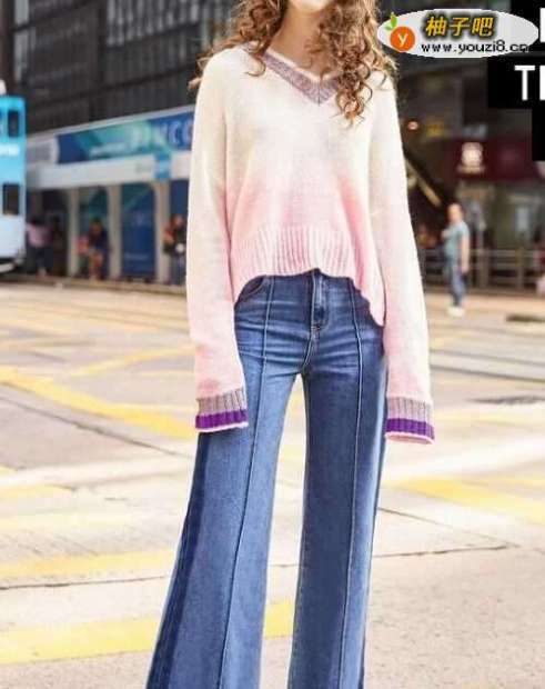 3浅粉色V领短款毛衣搭配蓝色微喇叭型阔腿牛仔裤,不但有很好的显瘦效果,同时会显得整个人特别有气场,非常适合身材比较高挑的女性朋友。