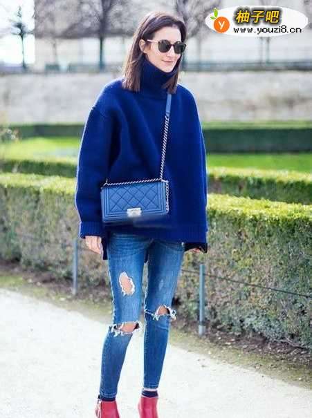 5深蓝色宽松毛衣搭配蓝色破洞牛仔裤红色高跟短靴,非常个性的穿搭,既潮流又有很好的保暖效果。