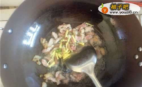 5等到肉六七分熟的时候,再放入料酒和生姜一起翻炒。