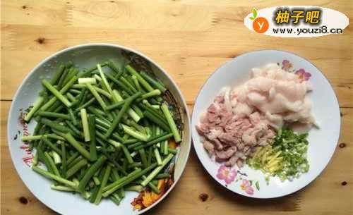 准备好需要的食材,蒜台切成段,五花肉切片,太肥的部分放一边,生姜葱花切好待用。