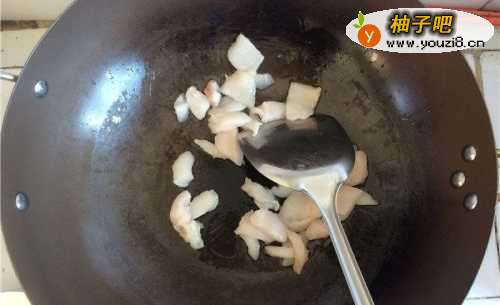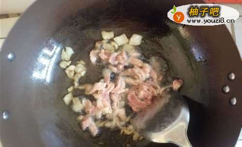 2锅里放少许油,然后把五花肉肥的部分先放入锅里煸出油。