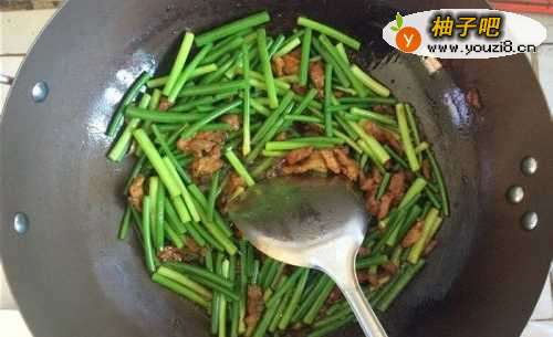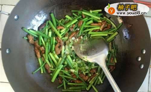 8等到蒜台八九分熟的时候,就能放入鸡精和盐,翻炒几下就能出锅了。