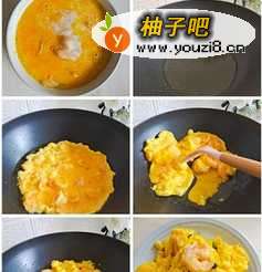 3鸡蛋加盐A打散备用,锅底倒入油,放入虾仁滑散,炒至变色捞出倒入鸡蛋碗中