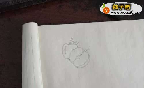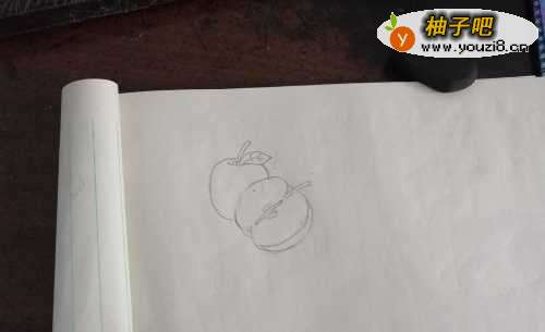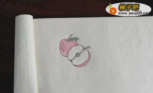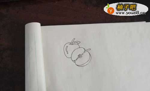 我们先画一个切开的苹果,如图一。再把苹果里边的种子画出来,如图二。