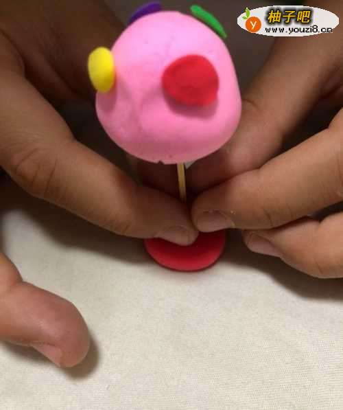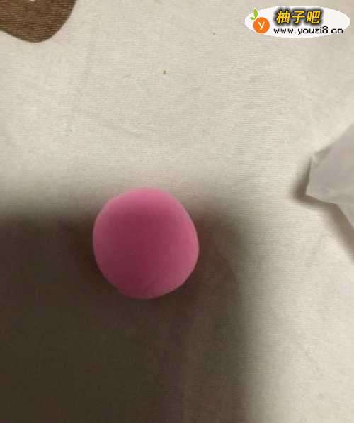 拿出粉色的彩泥揉成一个圆形,在用铅笔的圆形一端里面弄个窟窿。