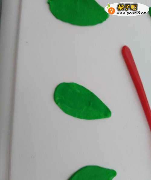 5绿色粘土制作叶子,先捏成水滴状,然后压扁,借助抹刀划出叶脉,将其轻轻对折下